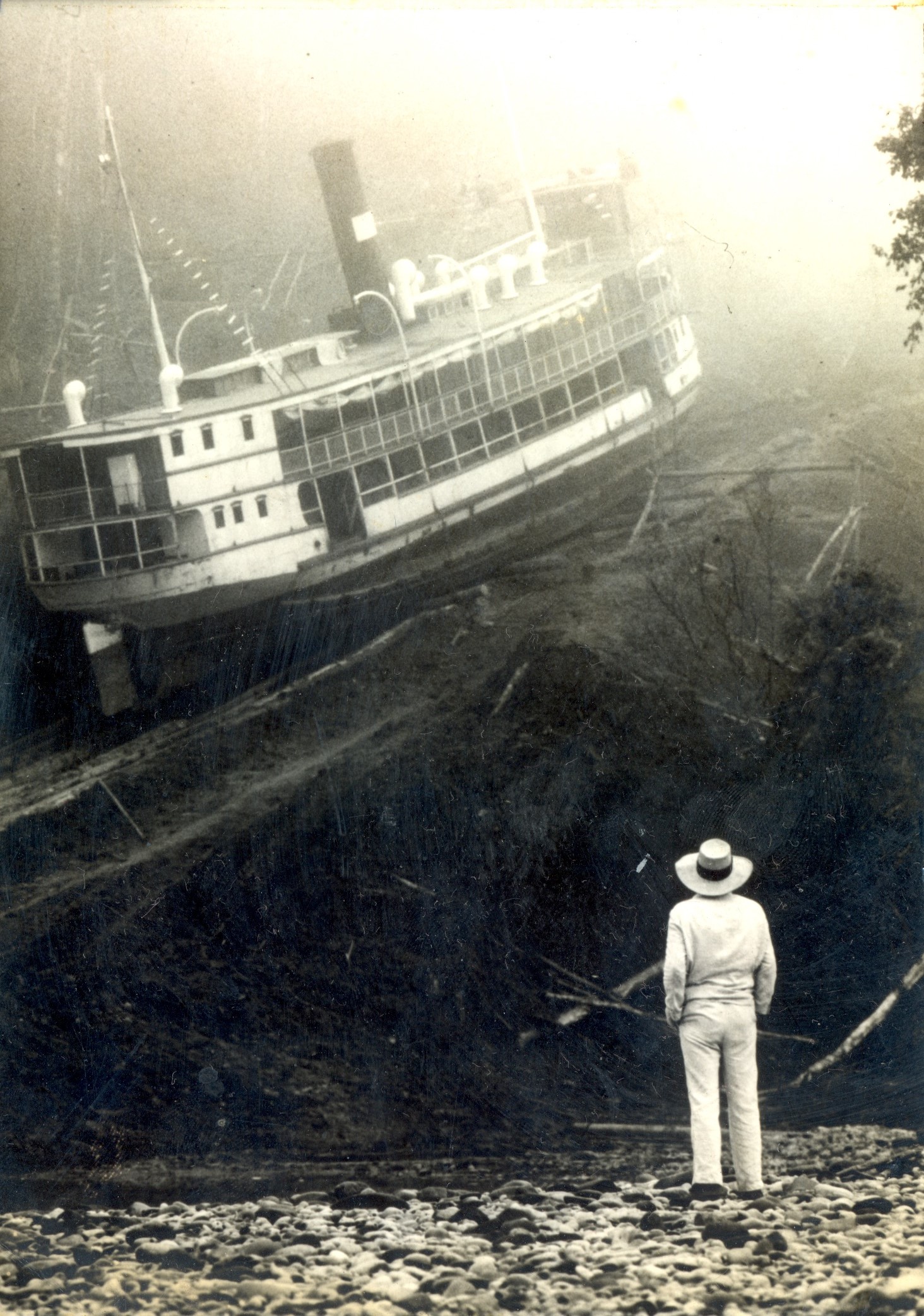 This photograph shows the boat that was part of Fitzcarraldo: – Klaus Kinski watches the SS Molly Aida crossing the mountain from one river to the other